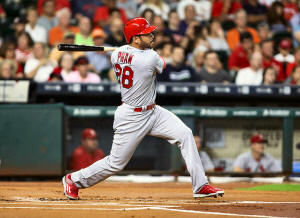 Cardinals left fielder Tommy Pham (28) hits a double during the