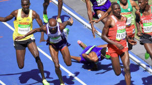 Mo Farah of Britain runs as Mead Hassan of USA falls after they