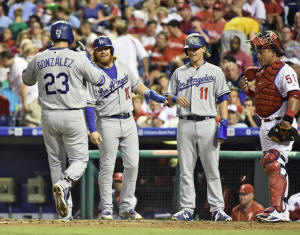 Dodgers first baseman Adrian Gonzalez (23) celebrates his three run