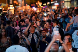 People crowd 42nd Street near Times Square to take pictures as the