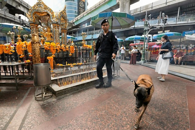 A Thai policeman and his dog inspect around the Erawan shrine during