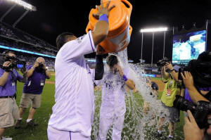 Perez (13) pours the water cooler on left fielder Alex Gordon (4)