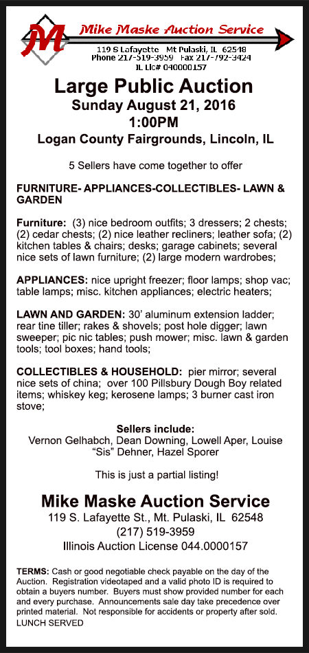 Click on Maske Auction Service ad for sale bills and listings of auctions and goods.