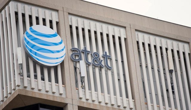 An AT&T Logo is pictured on the side of a building in Pasadena,