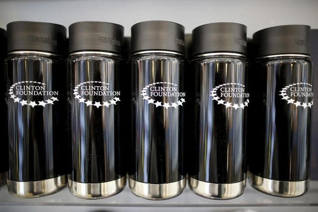 Clinton Foundation water bottles are seen for sale at the Clinton