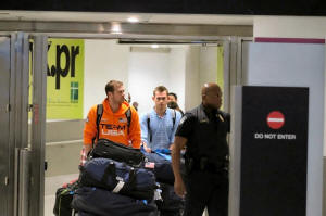 U.S. swimmers Jack Conger and Gunnar Bentz arrive on an overnight