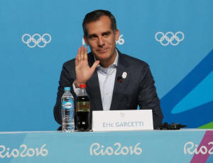 Los Angeles mayor Eric Garcetti during a LA2024 Los Angeles bid
