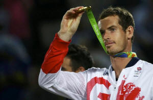 Gold medalist Andy Murray (GBR) of Britain reacts after receiving