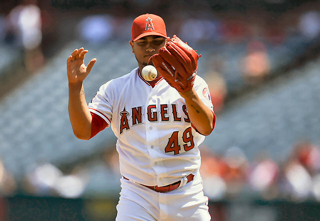 Angels starting pitcher Jhoulys Chacin (49) reacts after catching