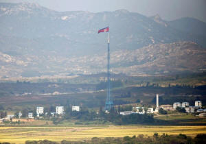 A North Korean flag is seen on top of a tower near the truce village