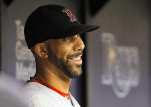 Red Sox starting pitcher David Price (24) smiles in the dugout at