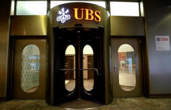 The logo of Swiss bank UBS is seen at the entrance of an office