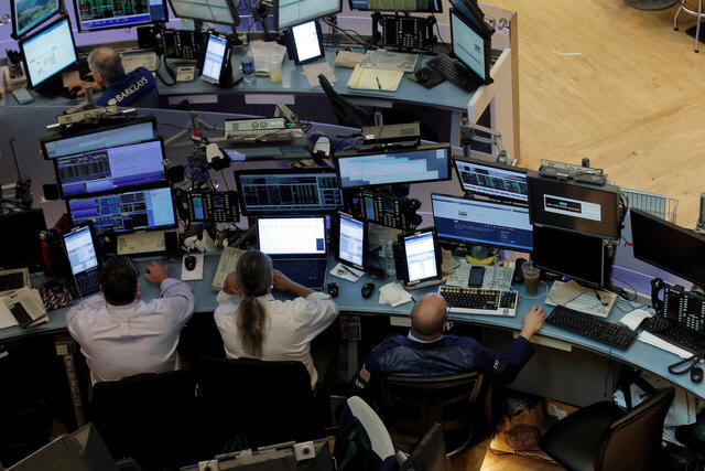 Traders work at desks on the floor of the New York Stock Exchange