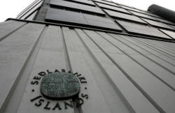 Iceland's Central Bank logo on the wall of the bank's main building