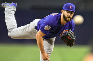 Cubs starting pitcher Jake Arrieta (49) pitches during the first