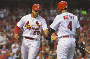 fielder Tommy Pham (28) is congratulated by catcher Yadier Molina