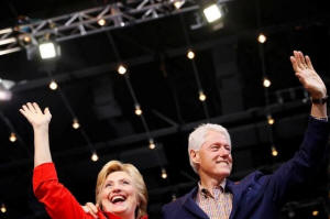 Hillary Clinton waves to the crowd with her husband Bill at in