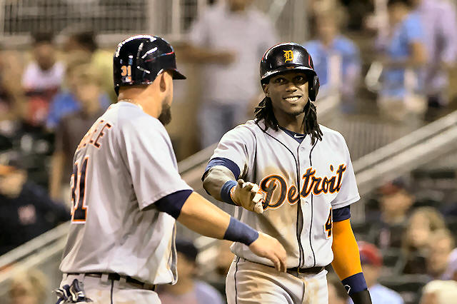 Tigers outfielder Cameron Maybin (4) congratulates third baseman