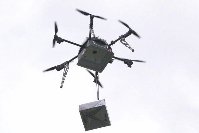 A delivery drone performs a test flight with a Domino's pizza box in