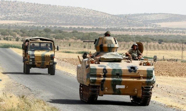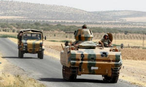 A Turkish armoured personnel carrier escorts a military vehicle on a