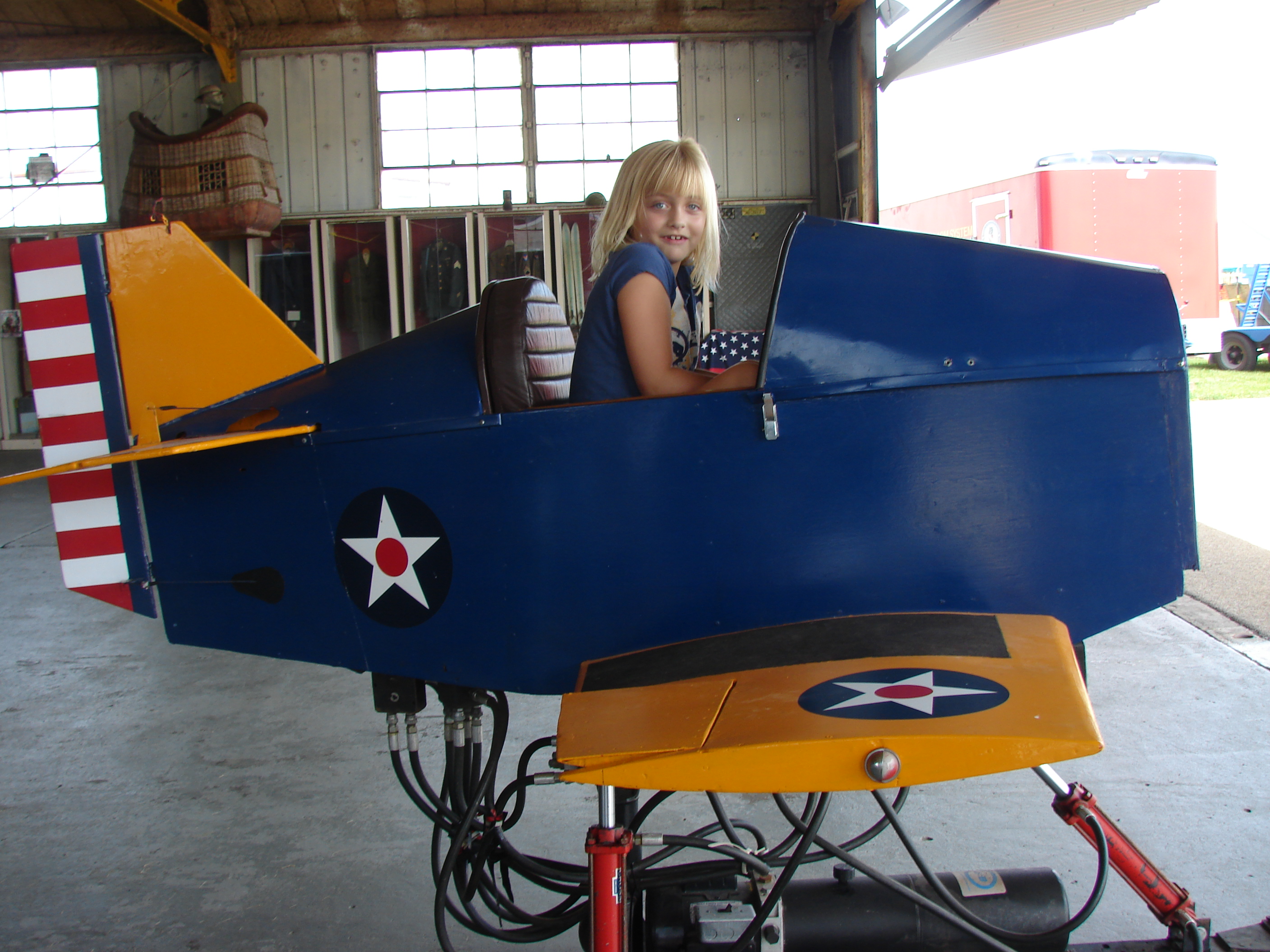 A young lady imagines herself as a pilot thanks to the child-sized real control input flight simulator offered by the Heritage in Flight Museum at the Logan County Airport,