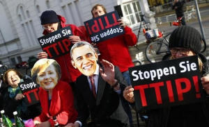 Chancellor Angela Merkel as they demonstrate against Transatlantic