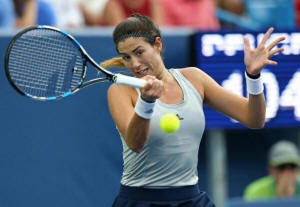 Garbine Muguruza (ESP) returns a shot against CoCo Vandeweghe (USA)