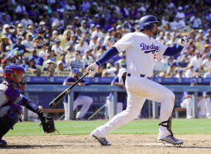 Dodgers first baseman Adrian Gonzalez (23) hits a single in the