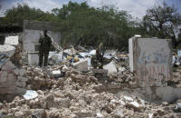 Security forces stand guard on a destroyed building following a