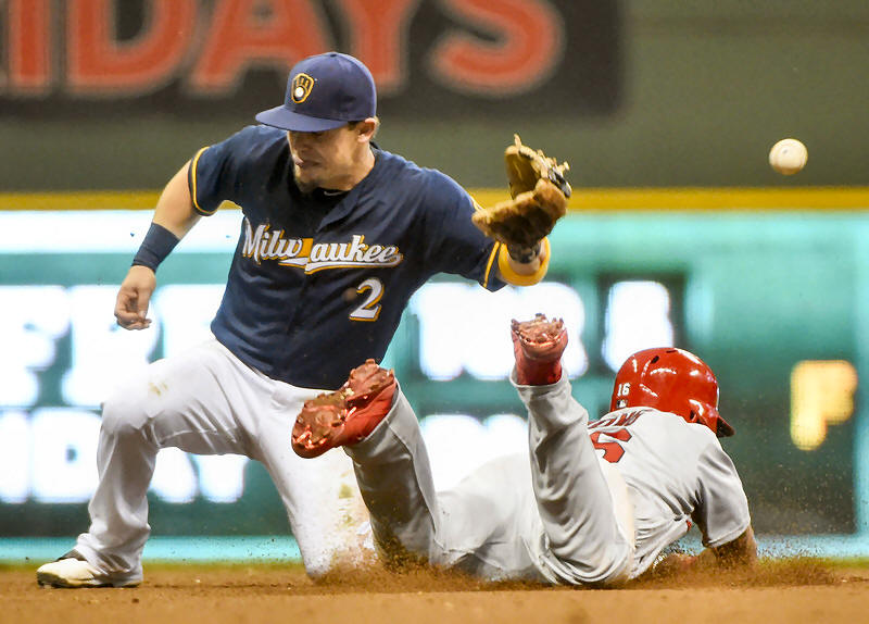 Kolten Wong, right, steals second base as the ball gets