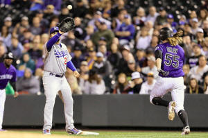 Rockies starting pitcher Jon Gray (55) is thrown out to Los Angeles