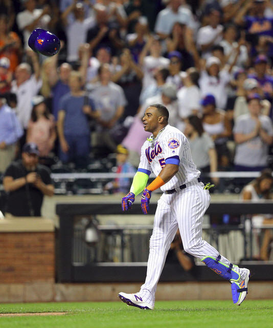 Mets left fielder Yoenis Cespedes (52) tosses his helmet as he
