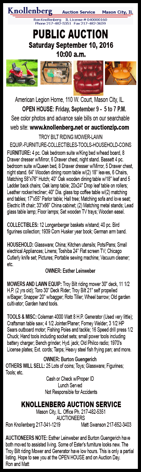 Click on Maske Auction Service ad for sale bills and listings of auctions and goods.