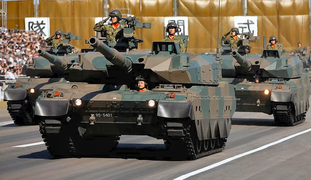 on Type-10 armoured tanks take part in a military review during the