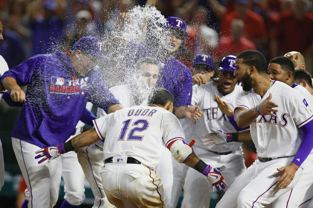 Rangers second baseman Rougned Odor (12) is mobbed by his teammates
