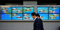 Men walk past an electronic board showing Japan's Nikkei average