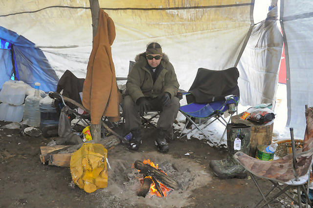 A man from the Comanche tribe sits by a fire in the Oceti Sakowin