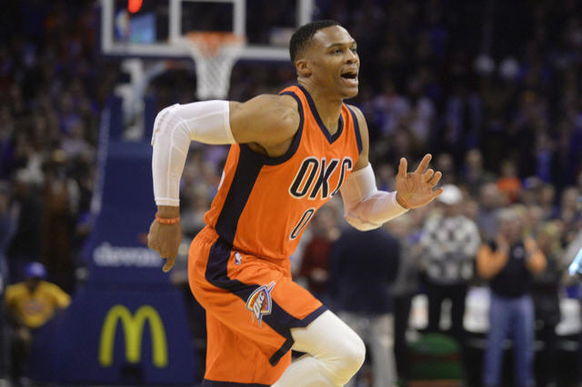 Thunder guard Russell Westbrook (0) takes the floor prior to