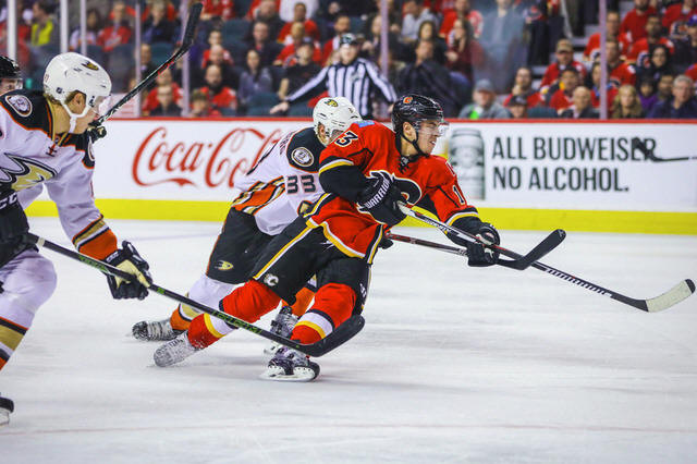 Johnny Gaudreau (13) and Anaheim Ducks right wing Jakob