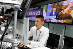 An employee of a foreign exchange trading company works in front of