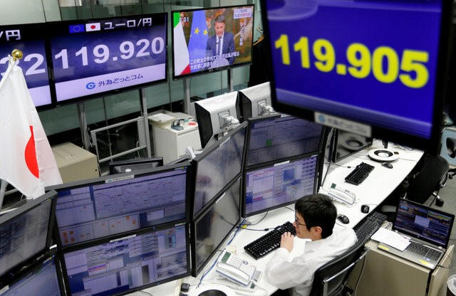 An employee of a foreign exchange trading company works near