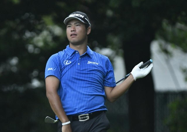 Hideki Matsuyama watches his tee shot on the second hole during the