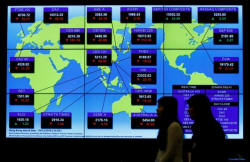 A panel displays global stock indexes at the Hong Kong Exchanges in