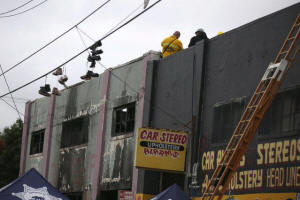Firefighters work inside the burned warehouse following the fatal