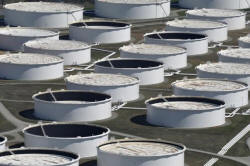 Crude oil storage tanks are seen from above at the Cushing oil hub,