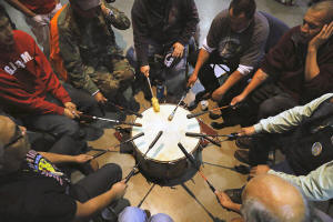 Native American drummers takes part in a "victory pow wow" to