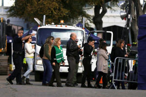 People with flowers are being escorted into a tent at the scene of