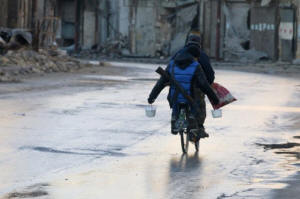 weapon on his back in rebel-held besieged old Aleppo, Syria December