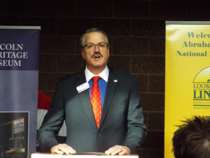 The day began with Museum Director Tom McLaughlin welcoming guests. He then called for the presentation of colors by the Lincoln American Legion Color Guard, while the college’s Assistant Professor of Vocal Music Laurie Lewis-Fitz sang the Star Spangled Banner.