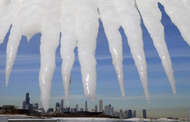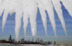 The Chicago skyline is framed by icicles in Chicago, Illinois,